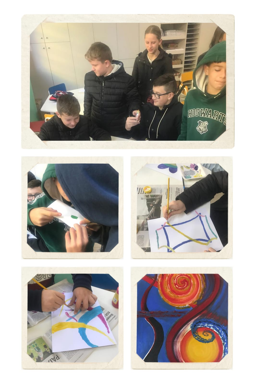 Também observaram telas pintadas pelo professor de artes, Leandro Braun. Uma pintura que causou certo estranhamento nos estudantes, principalmente por se tratar de algo não figurativo e de entendimento subjetivo. Na oportunidade também puderam observar materiais novos como a tinta acrílica e a óleo, perceberam o cheiro a pigmentação e a consistência do material. Após foram desafiados a criar uma pintura abstrata com tentativa de dar volume e movimento às formas, através de luz e sombras e direção das linhas e posição das figuras.