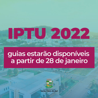 O Governo de Santa Clara do Sul informa que as guias de Imposto Predial e Territorial Urbano (IPTU), Alvará de Localização e Alvará Sanitário estarão disponíveis a partir de 28 de janeiro, quando o novo Código Tributário Municipal, que passou por um processo de atualização e modernização, começa a vigorar oficialmente.